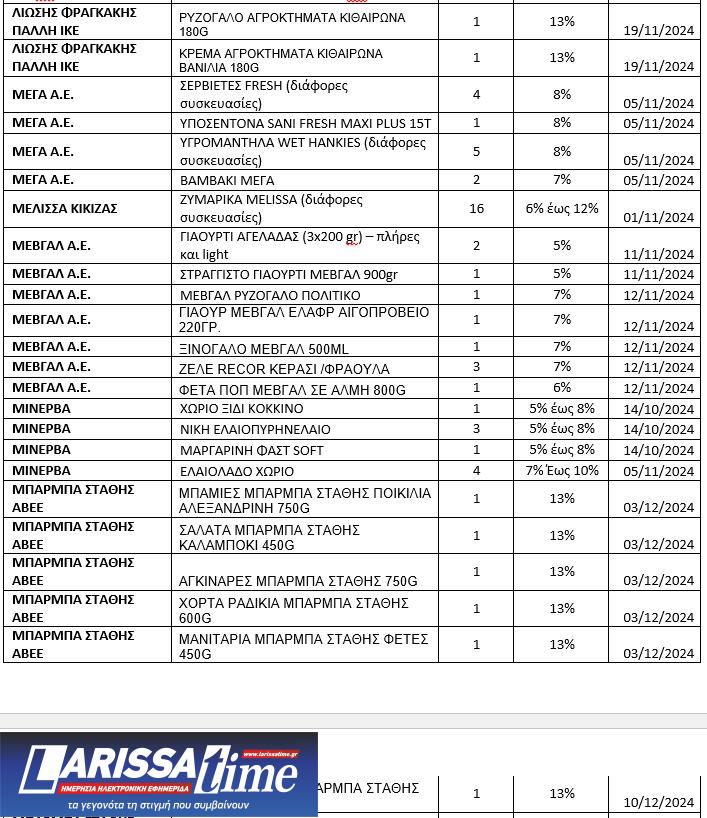 Οι μεγαλύτερες αυξήσεις καταγράφονται στις κατηγορίες: Φρέσκα ψάρια και θαλασσινά: +6,38%, ορεκτικά, αλίπαστα και άλλα σερβιριζομενα είδη: +5,90%, Αλκοολούχα ποτά: +5,49%, Μπισκότα, σοκολάτες, ζαχαρώδη: +3,45%, Νερά, αναψυκτικά, χυμοί: +3,43%.