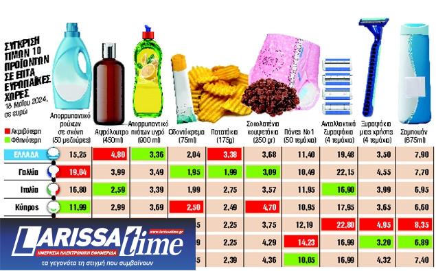 Η τιμή ενός πολύ γνωστού απορρυπαντικού ρούχων σε σκόνη (50 μεζούρες) είναι στην Ελλάδα 15,25 ευρώ, όταν στη Γαλλία είναι 19,04 ευρώ, στην Ιταλία 16,80, στην Ισπανία 12,85, στην Κύπρο 11,99, στην Πορτογαλία 15,90 και στη Μάλτα 14,49 ευρώ. Τον περασμένο Δεκέμβριο, η Ελλάδα είχε την ακριβότερη τιμή με 19,85 ευρώ.
