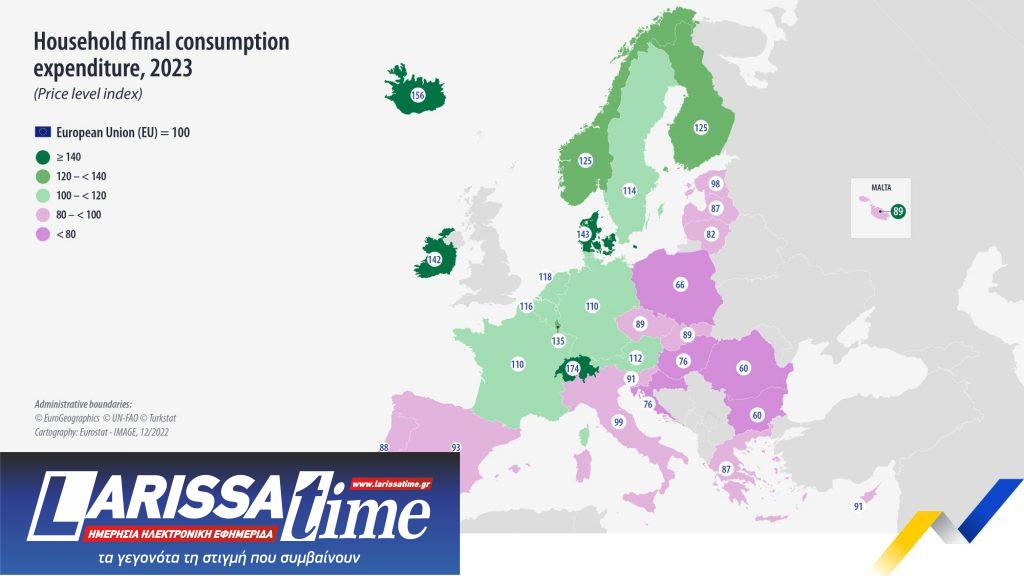 Ως προς την κατάταξη, στην κατηγορία έλαια-λίπη η Ελλάδα είναι η τέταρτη ακριβότερη χώρα με τις τιμές να διαμορφώνονται σε επίπεδα 26,3% πάνω από τον μέσο κοινοτικό όρο. Ακριβότερο από τον μέσο όρο στην Ε.Ε. πληρώνουν οι καταναλωτές στην Ελλάδα το ψωμί. Σε επίπεδα κάτω του μέσου ευρωπαϊκού όρου διαμορφώθηκαν οι τιμές στην Ελλάδα το 2023 στο κρέας (κατά 6,3%) και στα φρούτα-λαχανικά (14,1%).