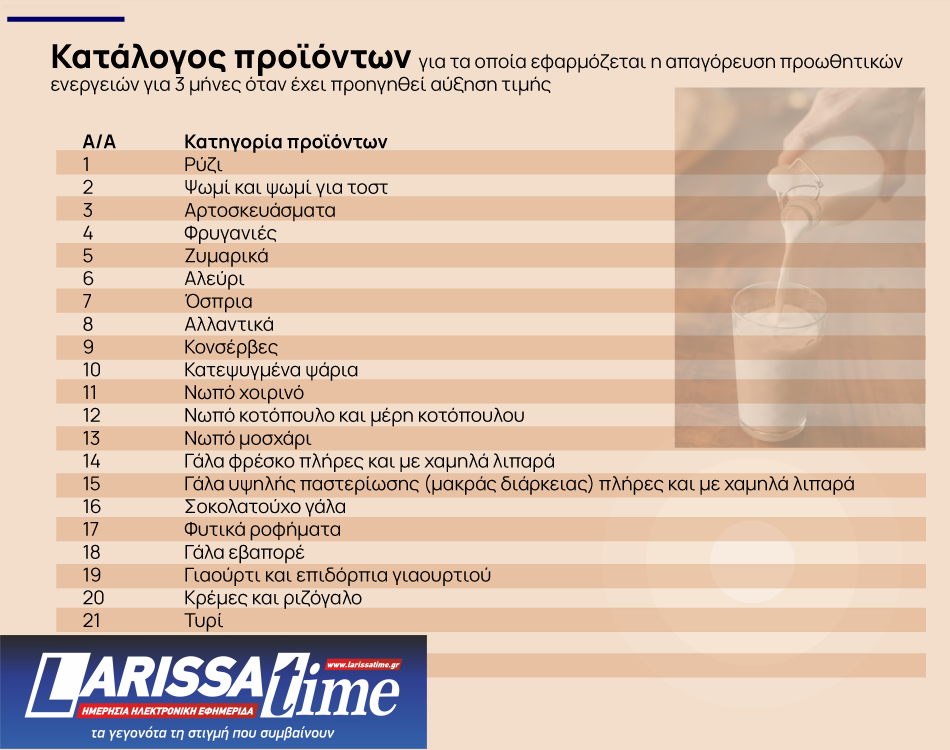 Νωρίτερα ο ΟΤ έγραφε πως με τις νέες αλλαγές η τρίμηνη απαγόρευση των προσφορών και των προωθητικών ενεργειών σε όσους προμηθευτές έχουν προχωρήσει σε ανατιμήσεις μετά τη 10η Ιανουαρίου, αφορά τις εξής κατηγορίες προϊόντων: