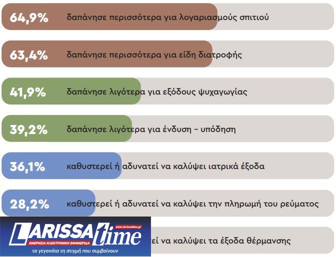 Οι αυξήσεις στα τρόφιμα επηρεάζουν το 72,4% των πολιτών σε τέτοιο βαθμό, ώστε να περιορίζουν δαπάνες για άλλες ανάγκες, ενώ οι δαπάνες για λογαριασμούς σπι-τιού και είδη διατροφής έχουν αυξηθεί για πάνω από το 60% των νοικοκυριών. Αντίθετα, 4 στους 10 μειώνουν τις εξόδους τους για ψυχαγωγία (41,9%) και αγορές ένδυσης-υπόδησης (39,2%).