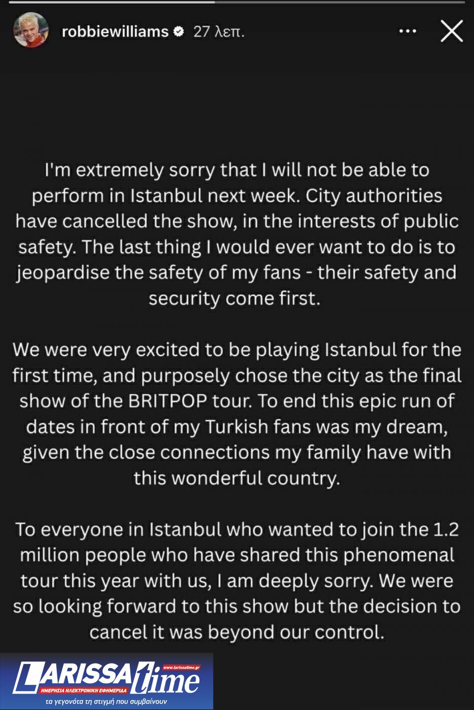 Λίγες μόλις ημέρες μετά την εκπληκτική συναυλία που έδωσε στην Αθήνα, ο Ρόμπι Γουίλιαμς ετοιμαζόταν για την επόμενη μεγάλη βραδιά στην Κωνσταντινούπολη, όμως, τελικά ο Βρετανός σταρ της ποπ ανακοίνωσε πως δεν πρόκειται να τραγουδήσει μπροστά στο τουρκικό κοινό.