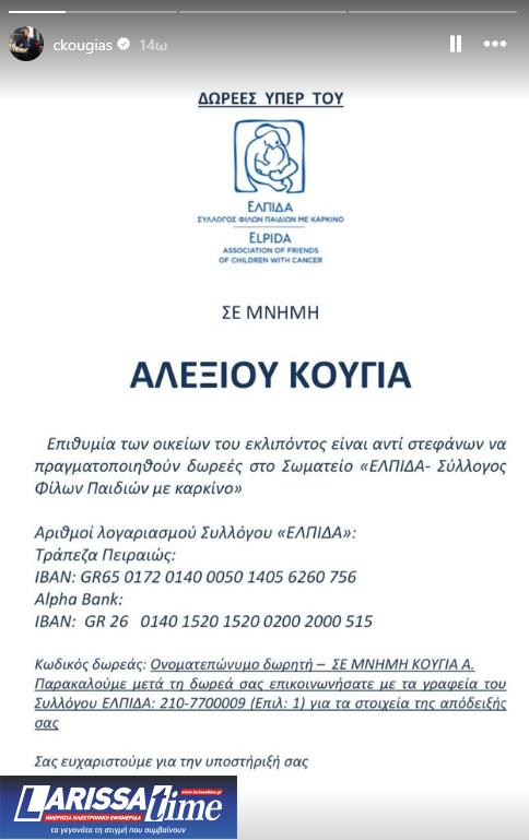 Επιθυμία της οικογένειας είναι, αντί στεφάνων, να γίνουν δωρεές στο Σωματείο «Ελπίδα – Σύλλογος Φίλων Παιδιών με καρκίνο», όπως υπενθύμισε ο γιος του Χρίστος, με νέα ανάρτησή του χθες Καθαρά Δευτέρα.