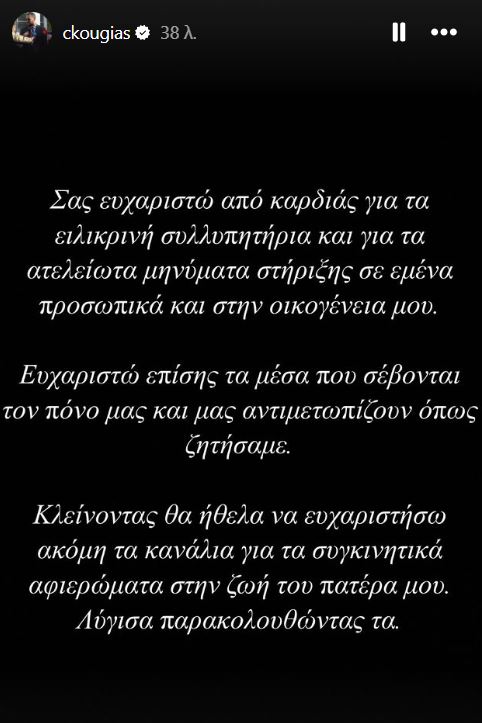 Κλείνοντας, θα ήθελα να ευχαριστήσω ακόμη τα κανάλια για τα συγκινητικά αφιερώματα στην ζωή του πατέρα μου. Λύγισα παρακολουθώντας τα» έγραψε στην ανάρτησή του ο Χρήστος Κούγιας.
