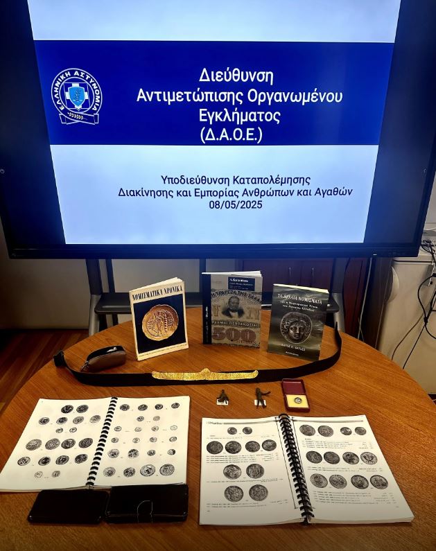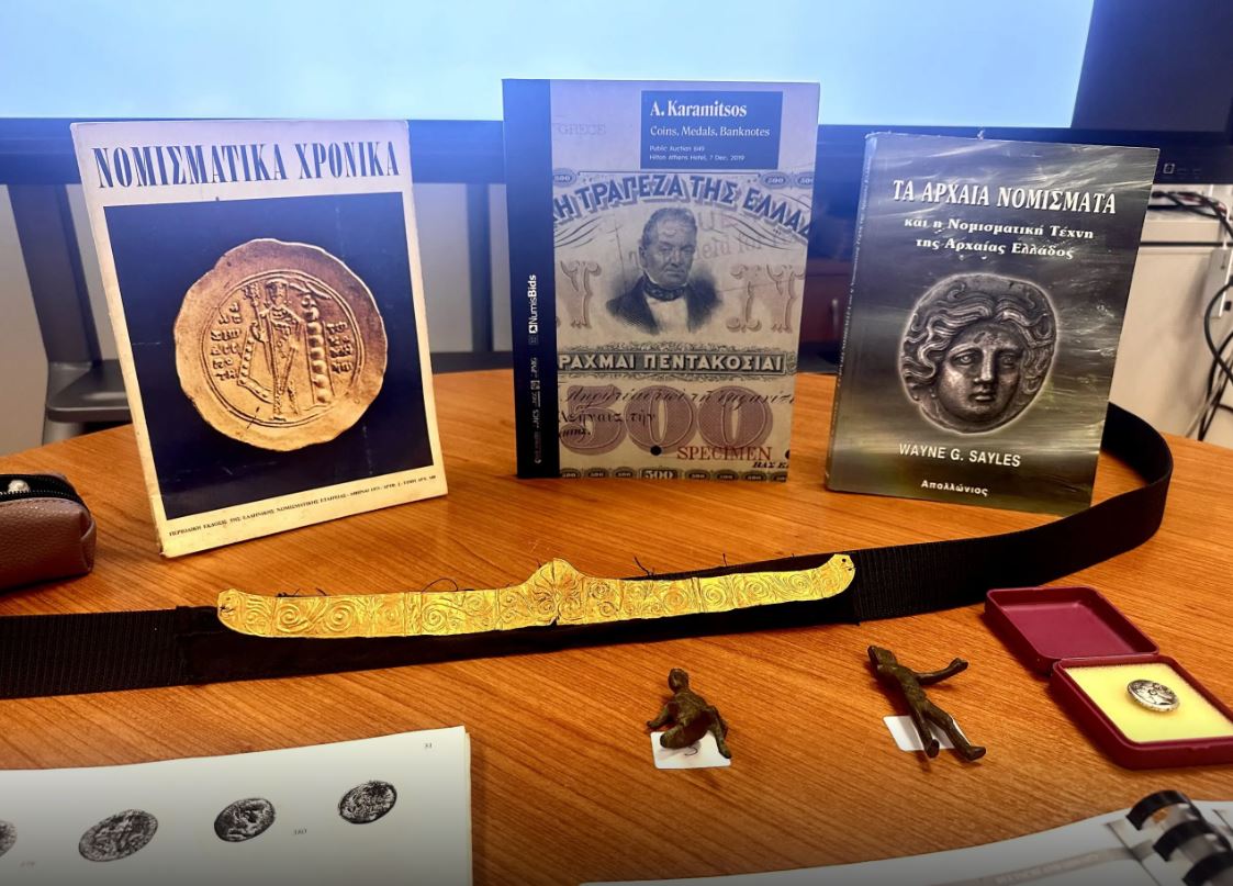 Συγκεκριμένα, είχαν προγραμματίσει την πώληση αρχαίου νομίσματος, δύο χάλκινων αρχαίων αγαλματιδίων και χρυσού αρχαίου διαδήματος.