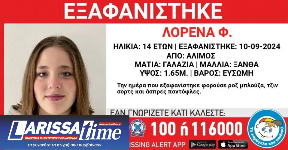 Σύμφωνα με το Χαμόγελο του Παιδιού, που προέβη στην ενεργοποίηση του μηχανισμού Missing Kid Alert, τα ίχνη του κοριτσιού χάθηκαν το βράδυ της Τρίτης 10/9, με αποτέλεσμα να προχωρήσει στη δημοσιοποίηση των στοιχείων του, κατόπιν εισαγγελικής εντολής, καθώς ενδέχεται να συντρέχουν σοβαροί λόγοι που θέτουν τη ζωή του σε κίνδυνο.