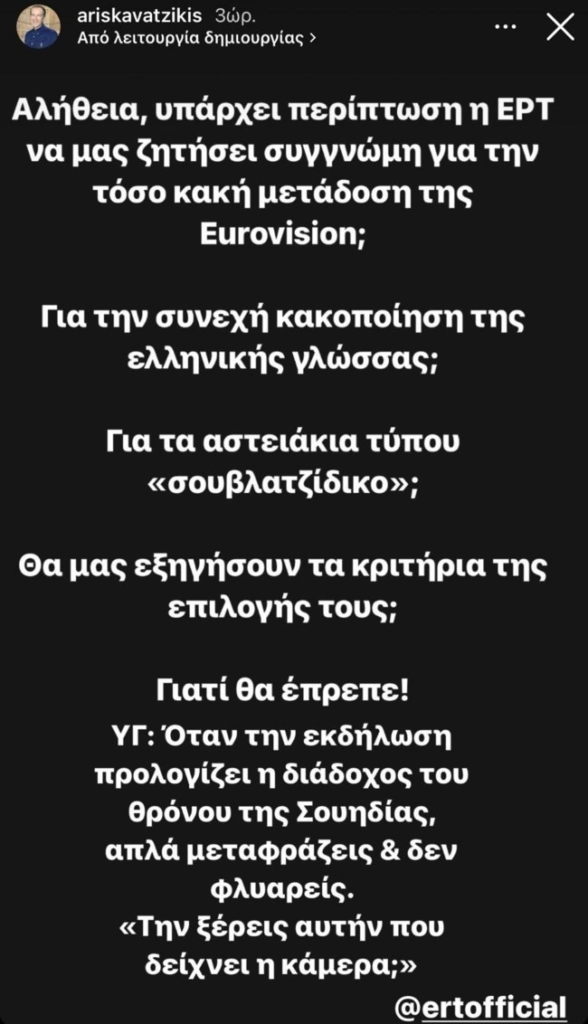 «Αλήθεια, υπάρχει περίπτωση η ΕΡΤ να μας ζητήσει συγγνώμη για την τόσο κακή μετάδοση της Eurovision; Για τη συνεχή κακοποίηση της ελληνικής γλώσσας; Για τα αστειάκια τύπου “σουβλατζίδικο”; Θα μας εξηγήσουν τα κριτήρια της επιλογής τους; Γιατί θα έπρεπε!» έγραψε στην ανάρτησή του ο Άρης Καβατζίκης ενώ δεν παρέλειψε να σχολιάσει εμμέσως και την γκάφα των δύο σχολιαστών του τελικού στην ΕΡΤ, όταν η κάμερα στράφηκε στην πριγκίπισσα Βικτώρια, Διάδοχο του θρόνου της Σουηδίας η οποία παρακολουθούσε live στο Malmö Arena. Τότε ο Ζερόμ απευθυνόμενος στον Θανάση Αλευρά τον ρώτησε: «Την ξέρεις αυτή που δείχνει η κάμερα;» για να λάβει την αρνητική απάντηση του ηθοποιού ο οποίος προφανώς δεν τη γνώριζε.