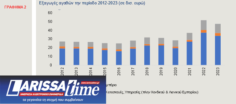 Επιπρόσθετα, σημαντική είναι η ενίσχυση της εξαγωγικής δραστηριότητας των βιομηχανικών επιχειρήσεων, μολονότι ένα μέρος της ανόδου της αξίας των εξαγωγών τη διετία 2022-2023 οφείλεται στον πληθωρισμό. Το 2017, οι βιομηχανικές εξαγωγές διαμορφώθηκαν σε Ευρώ 19 δισ., αντιπροσωπεύοντας το 67,2% των συνολικών εξαγωγών αγαθών, ενώ σταδιακά αυξήθηκαν σε Ευρώ 33,8 δισ. το 2023 (Γράφημα 2), αντιπροσωπεύοντας το 71,4% των συνολικών εξαγωγών αγαθών. Οι επενδύσεις δηλαδή του κλάδου αυξήθηκαν στο διάστημα αυτό (2017-2023) με μέσο ετήσιο ρυθμό άνω του 10%. Δεδομένου ότι διαχρονικά οι βιομηχανικές εξαγωγές προέρχονται σχεδόν εξ ολοκλήρου από τη μεταποίηση, είναι χρήσιμο να διερευνηθεί η εξωστρέφεια των κλάδων της μεταποίησης και πως αυτή έχει μεταβληθεί στον χρόνο. Για τον σκοπό αυτό χρησιμοποιείται για κάθε κλάδο της μεταποίησης και για δεδομένη χρονική περίοδο ο λόγος των εξαγωγών προς τη συνολική παραγωγή . Ο λόγος αυτός καταδεικνύει το ποσοστό της συνολικής παραγωγής του εκάστοτε κλάδου που κατευθύνεται στο εξωτερικό, συνεπώς όσο υψηλότερο το εν λόγω ποσοστό, τόσο μεγαλύτερος είναι και ο εξαγωγικός προσανατολισμός του κλάδου.