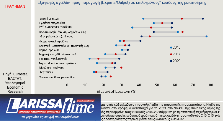 Ο κλάδος των βασικών μετάλλων είναι αυτός με τον μεγαλύτερο εξαγωγικό προσανατολισμό για το 2023, καθώς πάνω από τα ¾ της παραγωγής κατευθύνθηκαν στο εξωτερικό. Ακολούθησαν τα προϊόντα πετρελαίου και η κατασκευή ηλεκτρονικών υπολογιστών, ηλεκτρονικών και οπτικών προϊόντων, με τις εξαγωγές να αντιπροσωπεύουν πάνω από το 58% της παραγωγής τους. Η μικρότερη εξαγωγική δραστηριότητα από τους κλάδους που περιλαμβάνονται στο γράφημα (βλ. Σημείωση) καταγράφεται στην κατασκευή επίπλων και τις λοιπές μεταποιητικές δραστηριότητες, καθώς και στη χαρτοποιία.