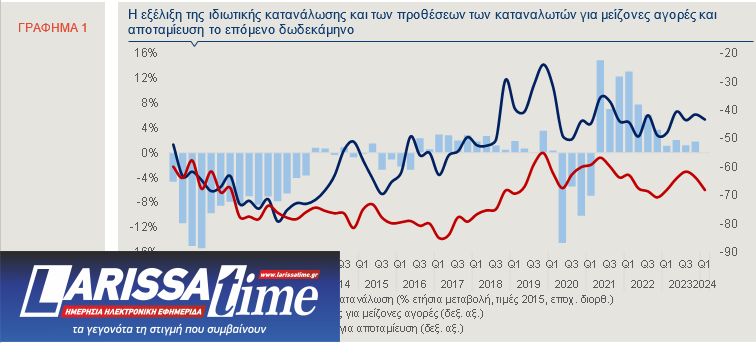 Τα ισοζύγια απαντήσεων για την πραγματοποίηση μειζόνων αγορών και τις προθέσεις των καταναλωτών για αποταμίευση παραμένουν σε αρνητικό έδαφος. Η πορεία των δύο δεικτών, κατά το τελευταίο έτος, ωστόσο, αντανακλά μικρότερη απαισιοδοξία σε σχέση με το πρόσφατο παρελθόν, η οποία οφείλεται, πιθανότατα, μεταξύ άλλων παραγόντων, στη σταδιακή αποκλιμάκωση του πληθωρισμού αλλά και την ενίσχυση του διαθέσιμου εισοδήματος.