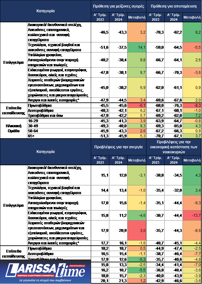 Επιπρόσθετα, οι καταναλωτές, εμφανίζονται, το πρώτο τρίμηνο του 2024, λιγότερο απαισιόδοξοι για την πρόθεσή τους να αποταμιεύσουν σε σχέση με τα πολύ χαμηλά επίπεδα που παρατηρήθηκαν κατά το πρώτο εξάμηνο του 2017, ενώ παρέμειναν σταθερές σε σύγκριση με το ίδιο περυσινό τρίμηνο. Σε ό,τι αφορά στις ηλικιακές ομάδες, το ισοζύγιο απαντήσεων, το πρώτο τρίμηνο του έτους, ήταν χαμηλότερο για τους καταναλωτές ηλικίας 65 και άνω, καταγράφοντας, ωστόσο, βελτίωση σε ετήσια βάση, ενώ λιγότερο απαισιόδοξοι εμφανίστηκαν οι καταναλωτές ηλικίας 16-29 ετών, με τις προθέσεις τους για αποταμίευση να επιδεινώνονται οριακά σε σύγκριση με το πρώτο τρίμηνο του 2023.
