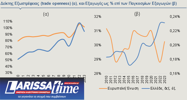 Πρώτον, ο δείκτης εξωστρέφειας, ο οποίος αντανακλά τη σημασία του διεθνούς εμπορίου για την ελληνική οικονομία, μετριέται ως ο λόγος του συνόλου των εισαγωγών και εξαγωγών προς το ΑΕΠ και έχει σημειώσει σημαντική βελτίωση τα τελευταία χρόνια. Το 2023, ο εν λόγω δείκτης προσέγγισε το 95%, πλησιάζοντας τον ευρωπαϊκό μέσο που διαμορφώθηκε σε 101,7%. Αξίζει να σημειωθεί, ότι ο εν λόγω δείκτης το 2010 ήταν μόλις 51%, ενώ, κατά μέσο όρο, τη δεκαετία του 1990 δεν ξεπερνούσε το 40%.