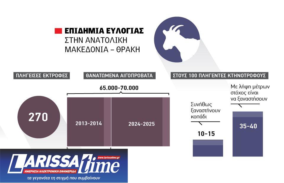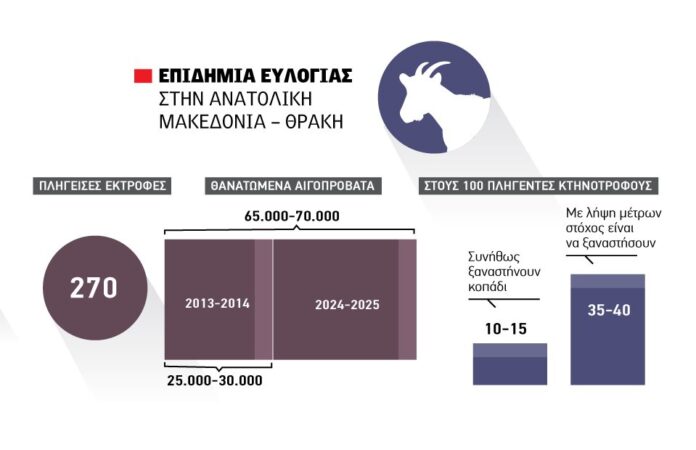 Ήδη από τις 20 Αυγούστου του 2024, όταν και διαπιστώθηκε επίσηµα το πρώτο κρούσµα ευλογιάς σε εκτροφή στον Έβρο, έχουν πληγεί συνολικά 270 κοπάδια και έχουν σφαγιαστεί περίπου 65.000 – 70.000 ζώα, κυρίως πρόβατα, σε όλη την Περιφέρεια Ανατολικής Μακεδονίας και Θράκης, µε συνέπεια ο κόσµος να µην µπορεί να κρύψει την απογοήτευσή του. «Η απώλεια είναι τεράστια. Το µεγαλύτερο πρόβληµα εντοπίζεται στον Έβρο, τόσο στο βόρειο όσο και στο νότιο κοµµάτι του νοµού και έπονται η Ροδόπη, η Καβάλα, η Ξάνθη και η Θάσος», επισήµανε στην Agrenda ο πρόεδρος του Κτηνοτροφικού Συλλόγου Καβάλας, Νίκος ∆ηµόπουλος.