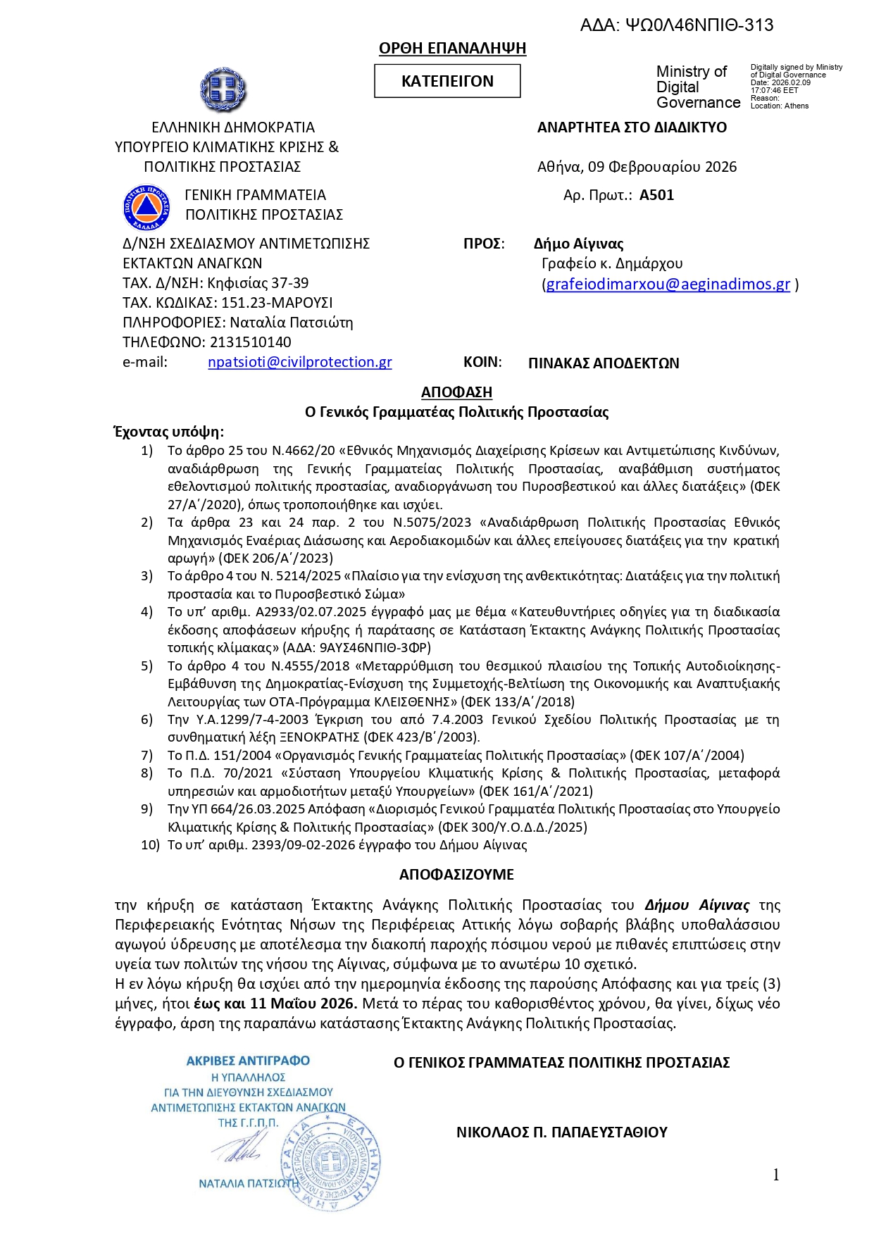 Η Αίγινα με απόφαση της Γενικής Γραμματείας Πολιτικής Προστασίας (9/2/2026) έχει κηρυχθεί σε κατάσταση έκτακτης ανάγκης λόγω της σοβαρής βλάβης του υποθαλάσσιου αγωγού ύδρευσης «με αποτέλεσμα την διακοπή παροχής πόσιμου νερού με πιθανές επιπτώσεις στην υγεία των πολιτών της νήσου της Αίγινας». Η απόφαση έχει τρίμηνη ισχύ, δηλ. έως τις 11 Μαΐου 2026.