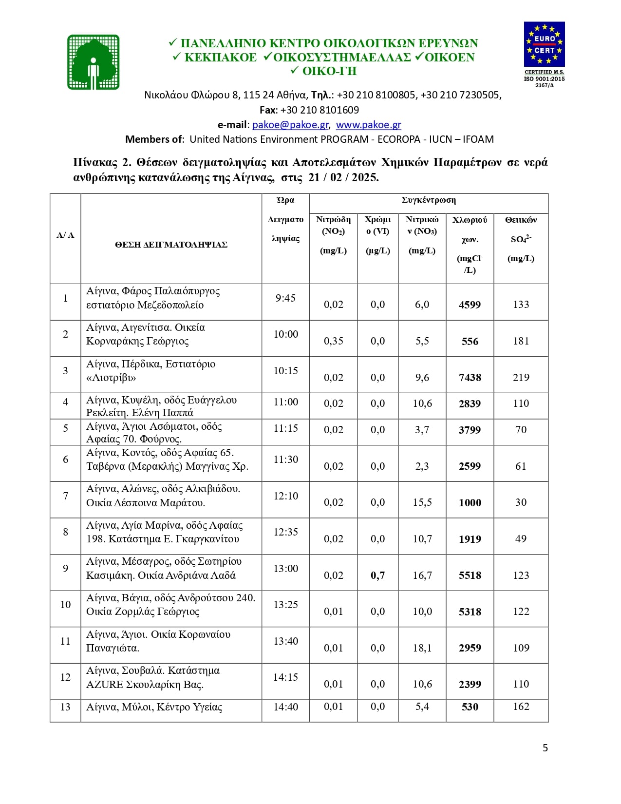 Το επιστημονικό συνεργείο του Πανελλήνιου Κέντρου Οικολογικών Ερευνών (ΠΑΚΟΕ) συνέλεξε δείγματα πόσιμου και θαλασσινού νερού στις 21 Φεβρουαρίου 2026, αποτυπώνοντας μια ιδιαίτερα ανησυχητική εικόνα για την ποιότητα των υδάτων στην Αίγινα, τόσο από μικροβιολογική όσο και από φυσικοχημική άποψη.