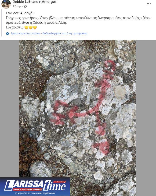 Χθες, ανάρτησε μία εικόνα σε γκρουπ της Αμοργού, στο οποίο φαίνεται με κόκκινη μπογιά ένα σύμβολο, που δείχνει στους περιπατητές τις διαδρομές που υπάρχουν στη συνέχεια του μονοπατιού.