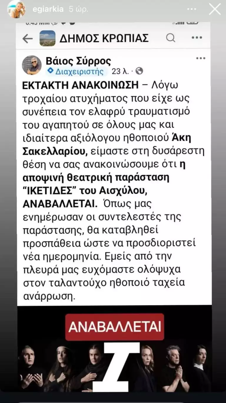 «Έκτακτη ανακοίνωση – Λόγω τροχαίου ατυχήματος που είχε ως συνέπεια τον ελαφρύ τραυματισμό του αγαπητού σε όλους μας και ιδιαίτερα αξιόλογου ηθοποιού Άκη Σακελλαρίου, είμαστε στη δυσάρεστη θέση να σας ανακοινώσουμε ότι η αποψινή θεατρική παράσταση “Ικέτιδες” του Αισχύλου, Αναβάλλεται.