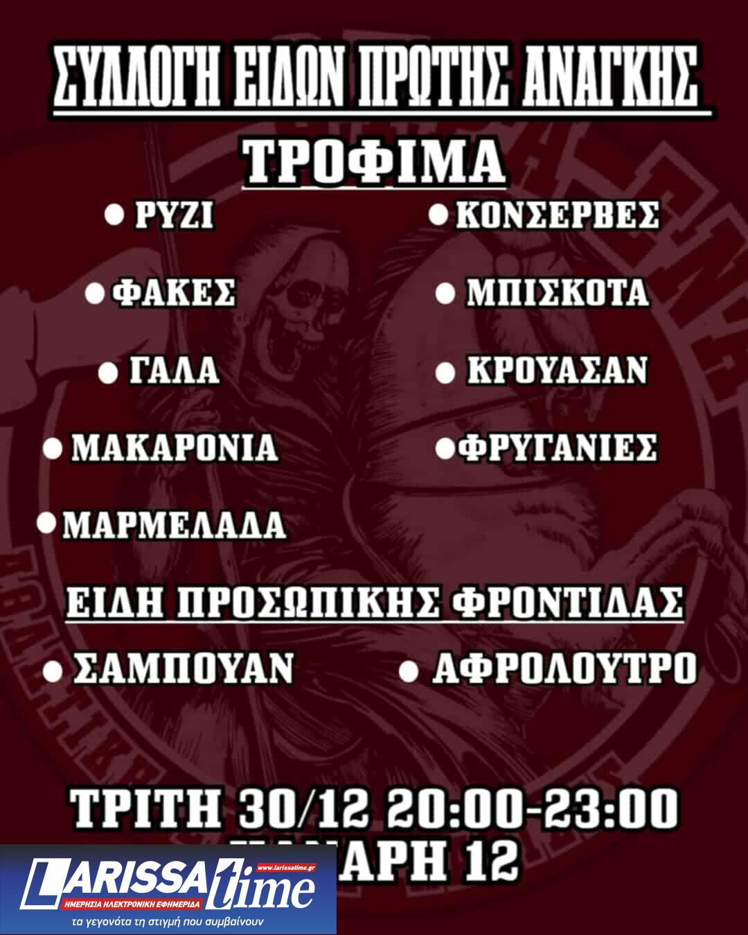 Τα πράγματα αφού συλλεχθούν θα παραδοθούν στο κοινωνικό παντοπωλείο του Δήμου Λαρισαίων.