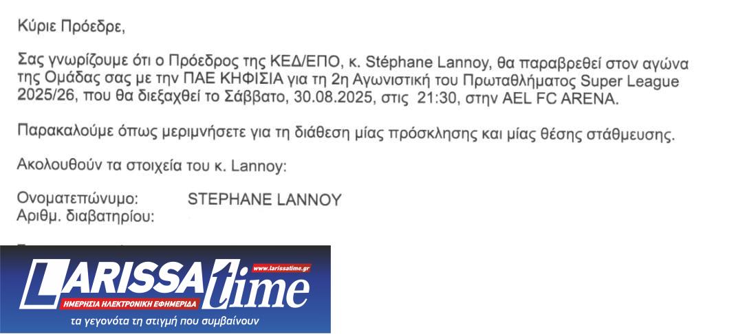 Η ΠΑΕ ΑΕΛ Novibet ενημερώθηκε σήμερα (26/08) με σχετική επιστολή της ΚΕΔ/ΕΠΟ πως στον αγώνα της ομάδας μας με την Κηφισιά, στο πλαίσιο της 2ης Αγωνιστικής της Stoiximan Super League, θα παραβρεθεί ο Αρχιδιαιτητής της ΚΕΔ/ΕΠΟ, κ. Στεφάν Λανουά.