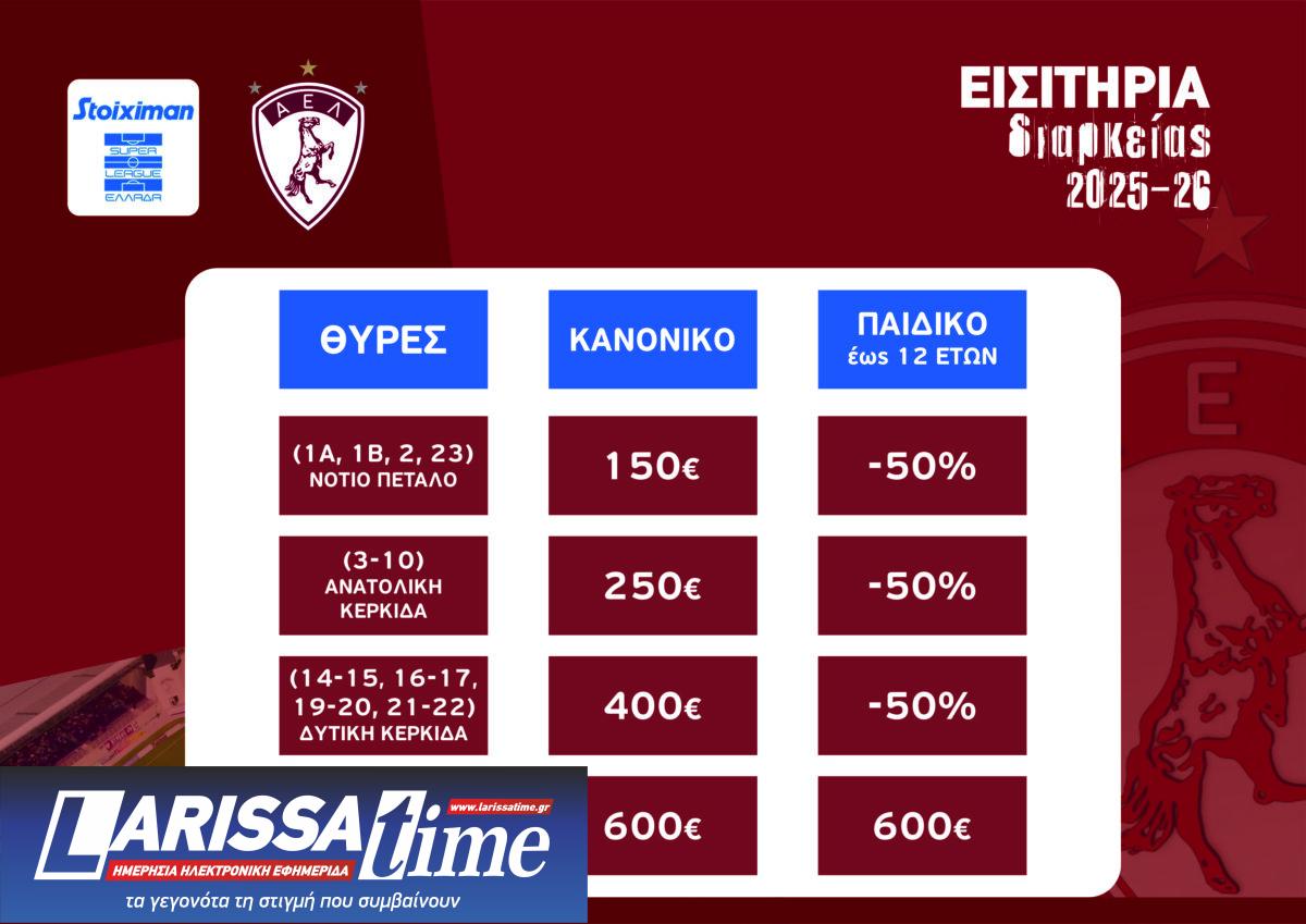 Με σύνθημα “Ησουν εκεί μαζί μας. Σε θέλουμε ξανά δίπλα μας!” η ΠΑΕ ΑΕΛ ενημερώνει ότι από σήμερα 20/5/2025 μέχρι και την Τρίτη 10/6/2025 οι περσινοί κάτοχοι εισιτηρίων διαρκείας μπορούν να διατηρήσουν τη θέση τους, στο ίδιο με πέρσι αντίτιμο, υλοποιώντας στο ακέραιο τις δεσμεύσεις της. Ήτοι οι περσινοί κάτοχοι των εισιτηρίων διαρκείας θα μπορούν να παρακολουθήσουν όλους τους εντός έδρας αγώνες στην επιστροφή της ΑΕΛ στο πρωτάθλημα της Superleague 1 σε τιμές αγώνων της Superleague 2!