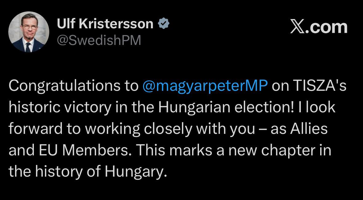 «Απόψε κέρδισαν η Ευρώπη και οι αρχές της. Συγχαρητήρια σε όλους τους Ούγγρους πολίτες και τις ιστορικές εκλογές».