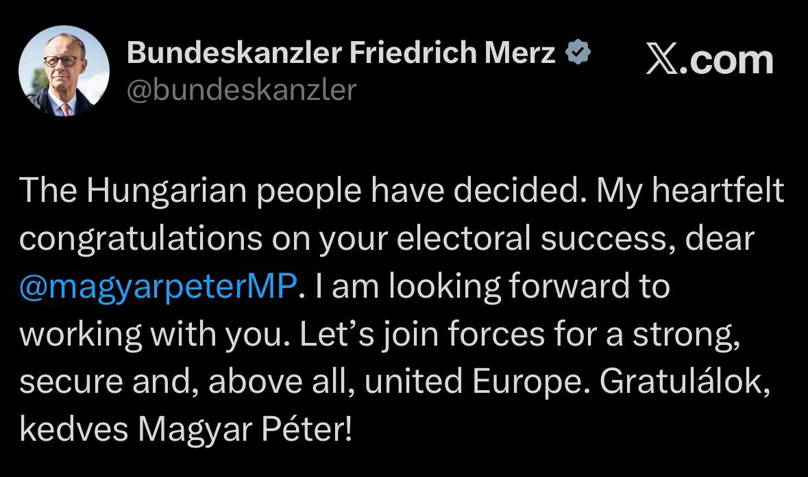 Από την πλευρά του, ο Γερμανός καγκελάριος, Φρίντριχ Μερτς, κάλεσε τον Πέτερ Μαγιάρ να «ενώσει τις δυνάμεις του για μια ισχυρή, ασφαλή και ενωμένη Ευρώπη».