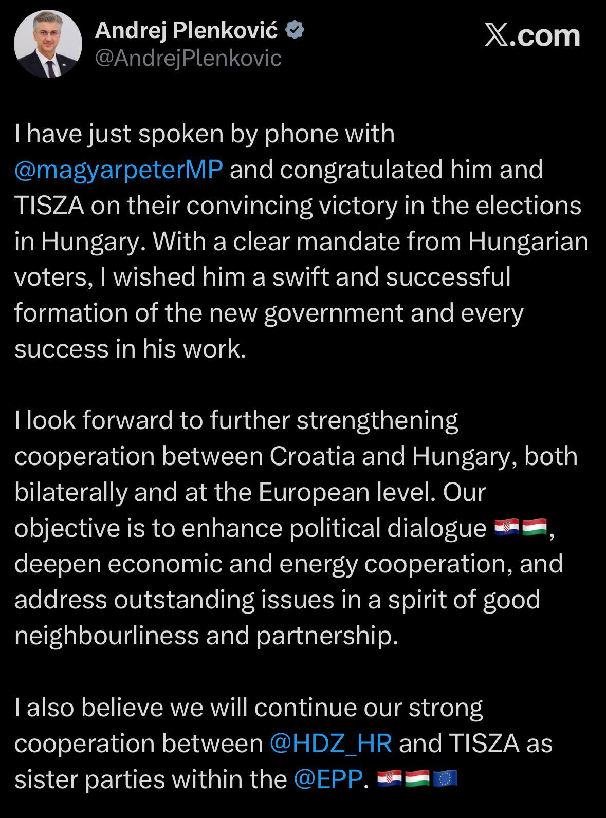 Je viens de m’entretenir avec Peter Magyar pour le féliciter de sa victoire en Hongrie !
