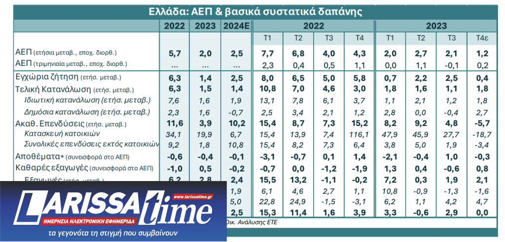 Η συρρίκνωση της αγροτικής παραγωγής λόγω της καταστροφικής πλημμύρας στη Θεσσαλία και η προσωρινή εξασθένηση των επενδύσεων παγίου κεφαλαίου επιβράδυναν την οικονομική δραστηριότητα κατά το 4ο τρίμηνο του 2023, ωστόσο προβλέπεται επιτάχυνση του ρυθμού ανάπτυξης στο 2,5%, ή ακόμη υψηλότερα, το 2024, αναφέρει σε ανάλυσή της η Εθνική Τράπεζα. Η ενδυνάμωση βασικών μηναίων δεικτών οικονομικής δραστηριότητας προμηνύει επιτάχυνση της ανάπτυξης του ΑΕΠ στο 1ο τρίμηνο του 2024, στο 1,8% ετησίως (0,7% εποχικά διορθωμένο, σε τριμηνιαία βάση), σύμφωνα με την επικαιροποιημένη πρόβλεψη της Δ/σης Οικονομικής Ανάλυσης της Εθνικής, κάτι που στηρίζει την πρόβλεψή της για την ανάπτυξη σε υψηλότερα επίπεδα εφέτος.