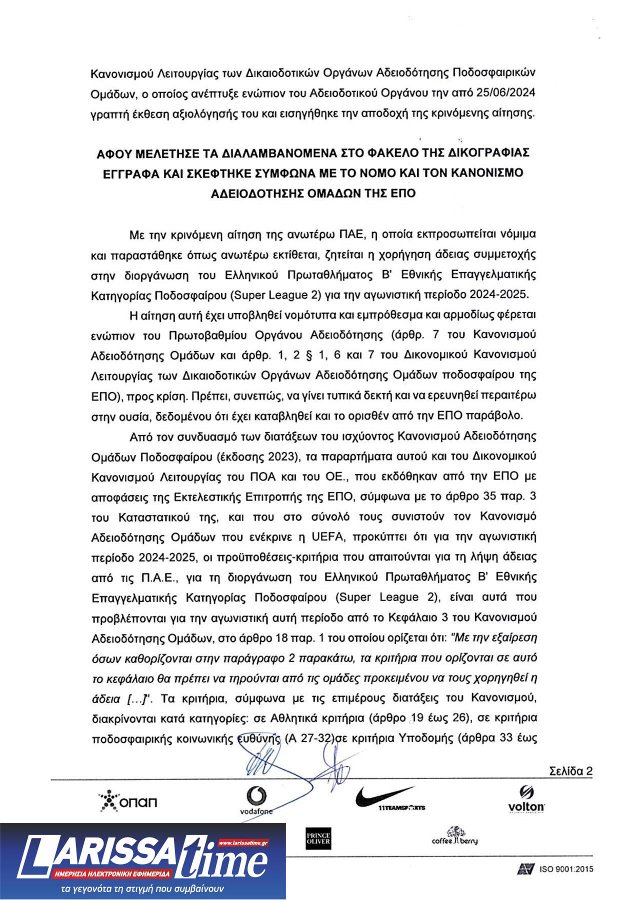 Το Πρωτοβάθμιο Όργανο Αδειοδότησης της Ελληνικής Ποδοσφαιρικής Ομοσπονδίας εξέτασε το φάκελο της ΠΑΕ ΑΕΛ και χορηγεί την άδεια για τις εγχώριες διοργανώσεις (Super League 2) για την αγωνιστική περίοδο 2024-2025.
