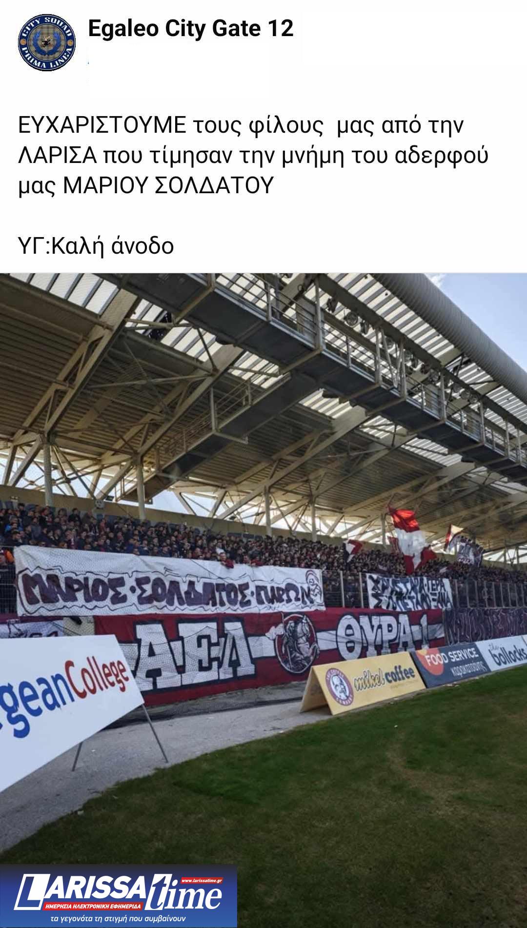 Με αφορμή το πανό “ΜΑΡΙΟΣ ΣΟΛΔΑΤΟΣ ΠΑΡΩΝ” που είχαν οι οπαδοί της ΑΕΛ στην εντός έδρας αναμέτρηση με τη Νίκη Βόλου την Κυριακή (22/12) στο AEL FC ARENA, για το φίλαθλο του Αιγάλεω, που είχε φύγει από τη ζωή δύο χρόνια πριν, οι φίλοι του Αιγάλεω, Egaleo City Gate 12, μέσα από τα social media ευχαρίστησαν τον κόσμο των «βυσσινί» και ευχήθηκαν καλή άνοδο στην ΑΕΛ.