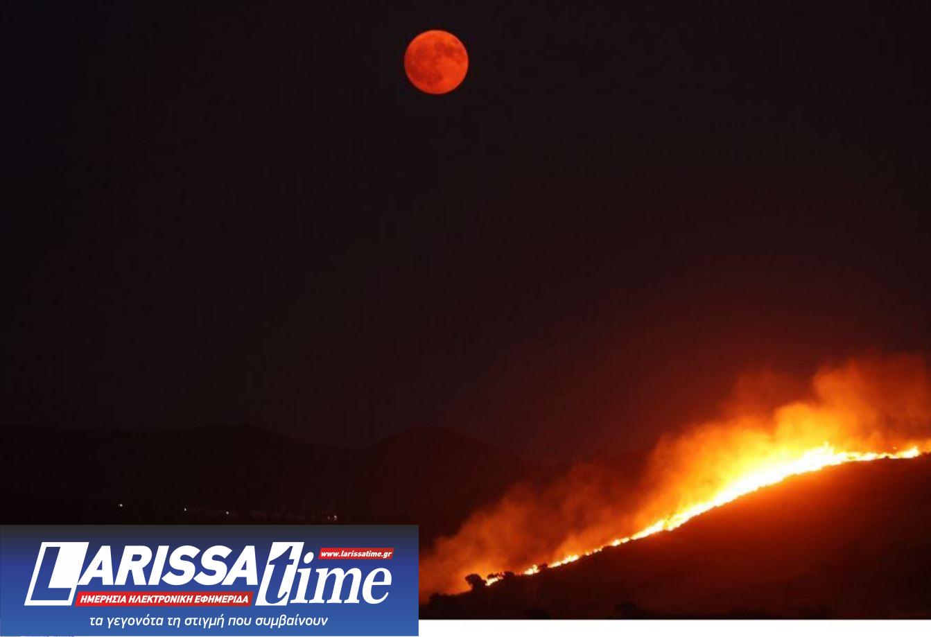 Πάνω από το καμένο τοπίο και τις φλόγες που συνεχίζουν να «καταπίνουν» ό,τι βρουν στο πέρασμά τους στην Ανατολική Αττική, η πανσέληνος δεσπόζει στο βάθος σαν σιωπηλός μάρτυρας της καταστροφής.