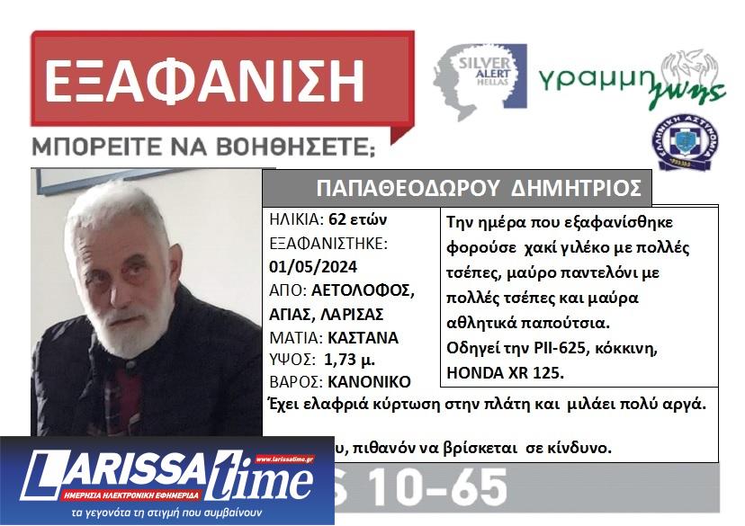 Ο 62χρονος οδηγεί την δίκυκλη μηχανή του, HONDA XR 125, κόκκινη, με πινακίδες ΡΙΙ-625. Τελευταία φορά εθεάθη στην Σωτηρίτσα Αγιάς, το απόγευμα της 1ης Μαΐου.
