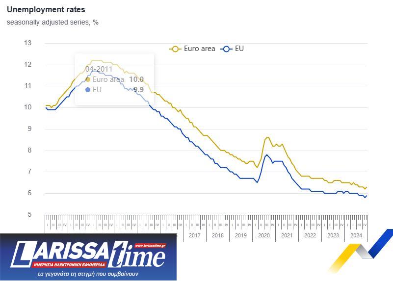 Τον Δεκέμβριο του 2024, το εποχικά προσαρμοσμένο ποσοστό ανεργίας στη ζώνη του ευρώ ήταν 6,3%, από 6,2% τον Νοέμβριο του 2024 και μειωμένο από 6,5% τον Δεκέμβριο του 2023. Σε επίπεδο ΕΕ, το ποσοστό ανεργίας διαμορφώθηκε σε 5,9% τον Δεκέμβριο του 2024, από 5,8% τον Νοέμβριο του 2024 και μειώθηκε από 6,0% τον Δεκέμβριο του 2023.
