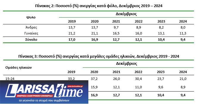 Στους Πίνακες 2 και 3 που ακολουθούν παρουσιάζεται το ποσοστό της ανεργίας, αναλυτικά, κατά φύλο και μεγάλες ομάδες ηλικιών, για το μήνα Δεκέμβριο των ετών 2019 έως και 2024.