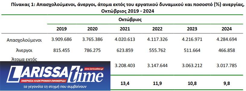 Οι άνεργοι ανήλθαν σε 466.858 άτομα σημειώνοντας μείωση κατά 44.806 άτομα σε σχέση με τον Οκτώβριο του 2023 (-8,8%) και αύξηση κατά 22.104 άτομα σε σχέση με τον Σεπτέμβριο του 2024 (5,0%).