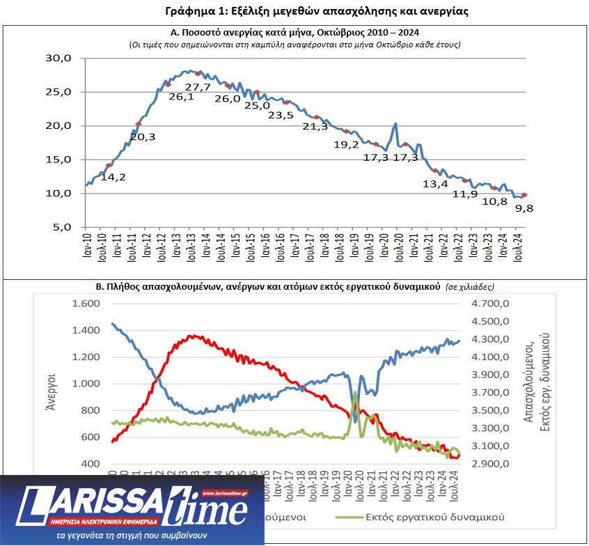 Το εποχικά διορθωμένο ποσοστό ανεργίας τον Οκτώβριο του 2024 ανήλθε σε 9,8% έναντι του αναθεωρημένου προς τα κάτω 10,8% τον Οκτώβριο του 2023 και του αναθεωρημένου προς τα άνω 9,4% τον Σεπτέμβριο του 2024, σύμφωνα με τα στοιχεία της ΕΛΣΤΑΤ.