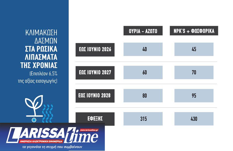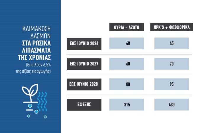 Υπενθυμίζεται πως η Ευρώπη σε πρώτο χρόνο έχει επιβάλλει δασμό 6,5% επί της καθαρής αξίας εισαγωγής, τόσο σε ουρία όσο και φώσφορο για όλες τις εισαγωγές από Ρωσία και Λευκορωσία. Επιπλέον δε, επιβαρύνει με κλιμακωτό φόρο από 40-45 ευρώ έως και 90 – 95 ευρώ ο τόνος μέχρι και τον Ιούνιο 2028. Από κει και πέρα, στην ουσία του πράγματος, το ρωσικό λίπασμα βγαίνει θεωρητικά εκτός εξίσωσης, με επιβαρύνσεις 315 έως 430 ευρώ ο τόνος αντίστοιχα.