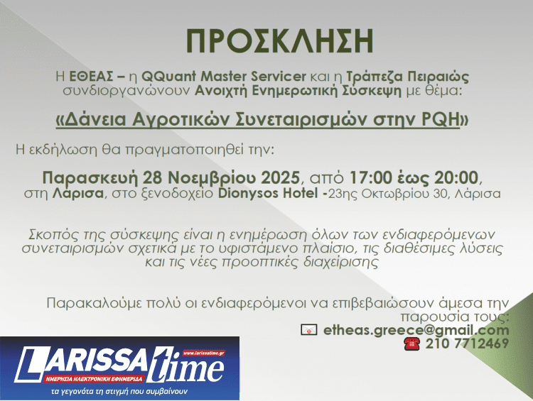 Ανοιχτή σύσκεψη για τα κόκκινα δάνεια αγροτών 28 Νοεμβρίου στη Λάρισα