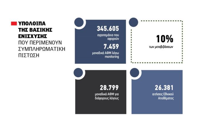 Συµπληρωµατικές πιστώσεις, οικολογικά σχήµατα και συνδεδεµένες ενισχύσεις δείχνει το πλάνο στα µπροστά. Για την ώρα δεν υπάρχει κάποιο χρονοδιάγραµµα, ωστόσο τα οικοσχήµατα δεν αναµένονται νωρίτερα από τις αρχές Φεβρουαρίου, ενώ και οι συνδεδεµένες φαίνεται να πηγαίνουν στην καλύτερη για… Μάρτιο µε Απρίλιο. Αυτό που για την ώρα παίζεται είναι το πότε θα ανοίξει η πλατφόρµα για διοικητικές πράξεις, ώστε να κάνουν τις όποιες αλλαγές κρίνουν οι παραγωγοί, για να ακολουθήσουν οι έλεγχοι και να βγει νέα παρτίδα πληρωµής. Υπενθυµίζεται ότι από την εξόφληση της βασικής έµειναν εκτός 345.605 αγροτεµάχια που αφορούν 7.459 µοναδικά ΑΦΜ λόγω monitoring, το 10% των µεταβιβάσεων, 28.799 µοναδικά ΑΦΜ για διάφορους λόγους και 26.381 αιτήσεις Εθνικού Αποθέµατος.