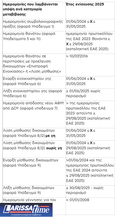 Παρακάτω παρατίθεται πίνακας με ημερομηνίες που είναι σε ισχύ για την μεταβίβαση δικαιωμάτων το έτος 2025 ανά υπόδειγμα μεταβίβασης.