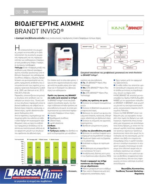 Το BRANDT InVigo® είναι ένας βιοδιεγέρτης τεχνολογίας αιχµής, που διατηρεί τα βέλτιστα επίπεδα προλίνης και γλουταθειόνης στο φυτό, τα οποία χρησιµοποιούνται ως ενισχυτικοί παράγοντες έναντι διαφόρων τύπων στρες: