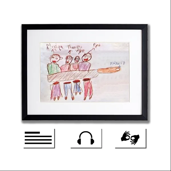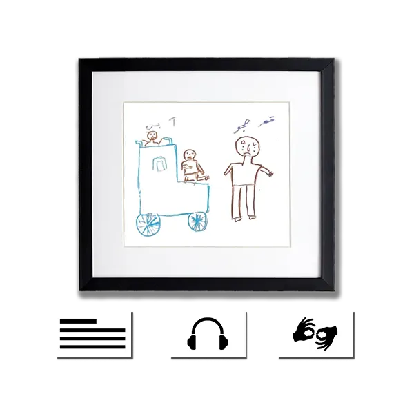Αυτή είναι η ζωγραφιά του Jamal, δώδεκα ετών, από τη Συρία. Είναι αυτός που κλαίει στα δεξιά. Δίπλα, ο πατέρας του είναι καθισμένος στο αναπηρικό αμαξίδιο, το οποίο σπρώχνει η μητέρα του. Παρουσιάζοντας τη ζωγραφιά του, ο Jamal είπε: «Στενοχωριέμαι να βλέπω τον πατέρα μου σιωπηλό και θλιμμένο. Μου λείπει να του μιλάω. Θέλω να του πω πως η ζωή δεν τελειώνει, επειδή δεν μπορείς να κουνήσεις τα πόδια και τα χέρια σου. Δεν ξέρω αν θα με ακούσει.». Ο πατέρας υπέστη εγκεφαλικό επεισόδιο μετά την εξαφάνιση των δύο αδελφών του κατά τη διάρκεια του πολέμου…