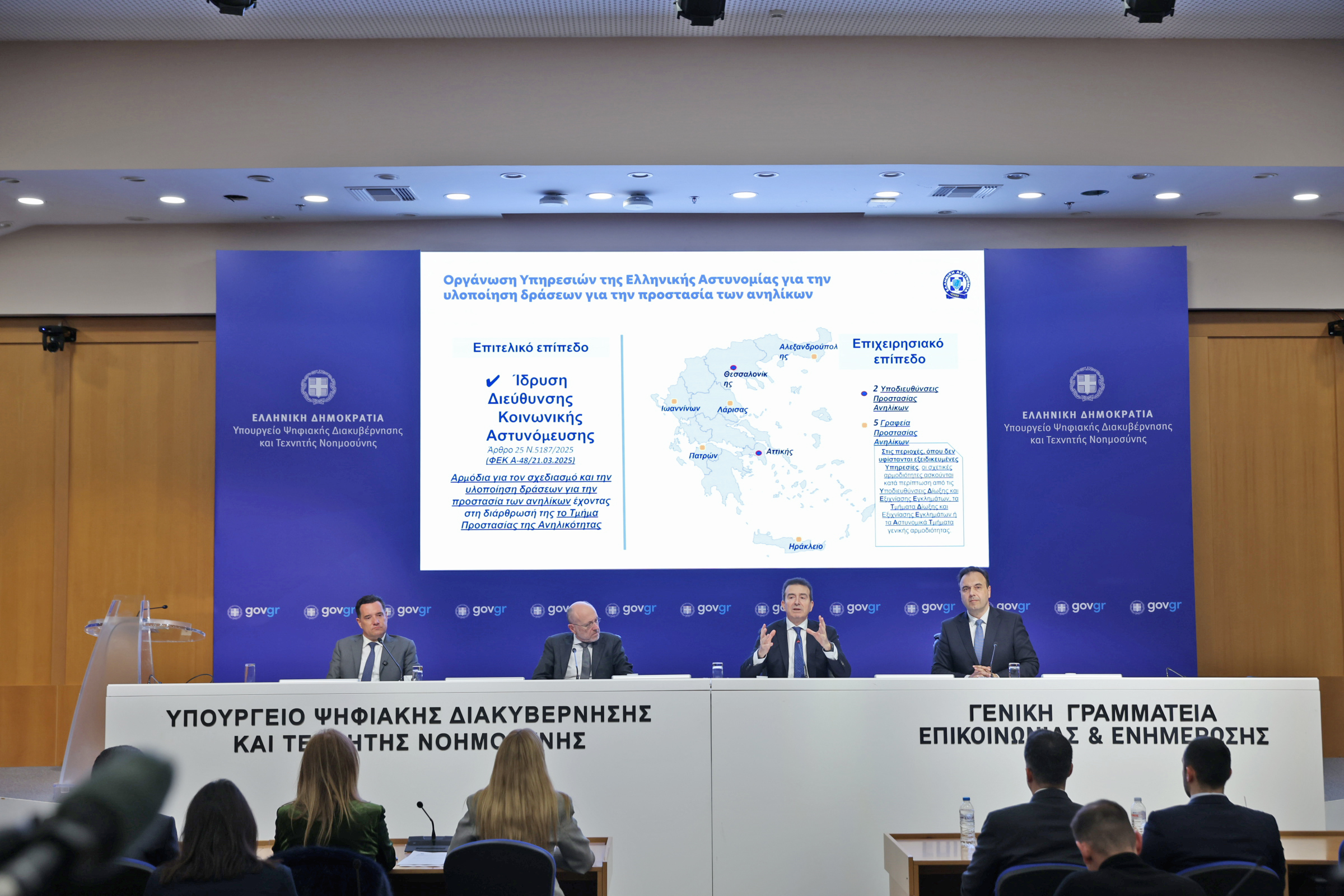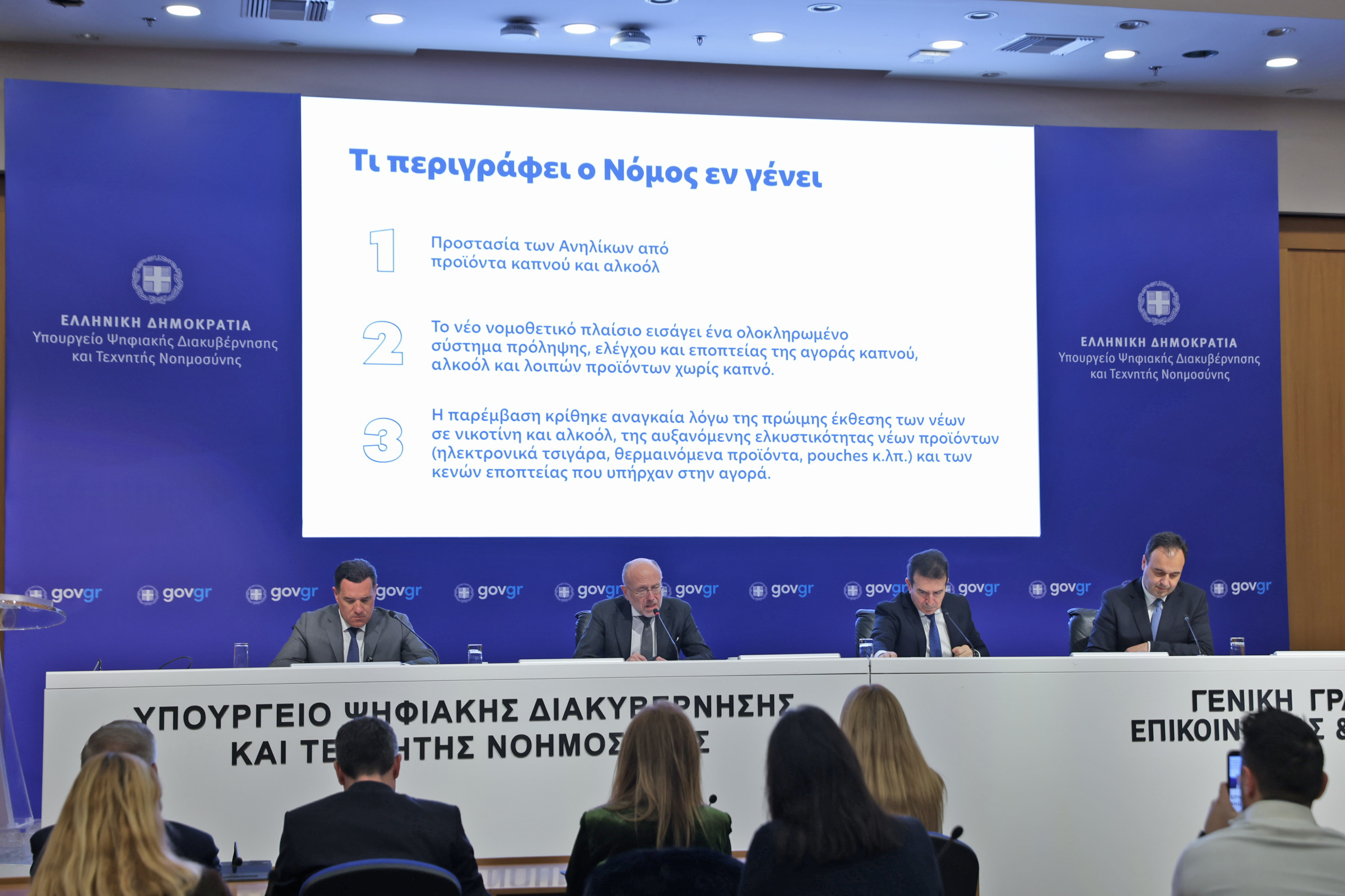 Παρουσιάστηκαν σήμερα ο «Οδικός Χάρτης και το Επιχειρησιακό Σχέδιο για την Καθολική Εφαρμογή της Απαγόρευσης Πώλησης Καπνικών Προϊόντων και Αλκοόλ σε Ανήλικους», από τους Υπουργούς Υγείας, Άδωνι Γεωργιάδη, Ψηφιακής Διακυβέρνησης & Τεχνητής Νοημοσύνης Δημήτρη Παπαστεργίου, Προστασίας του Πολίτη Μιχάλη Χρυσοχοΐδη και ο Υφυπουργός Υγείας Δημήτρη Βαρτζόπουλο.