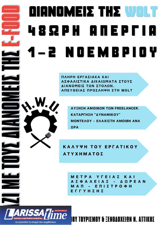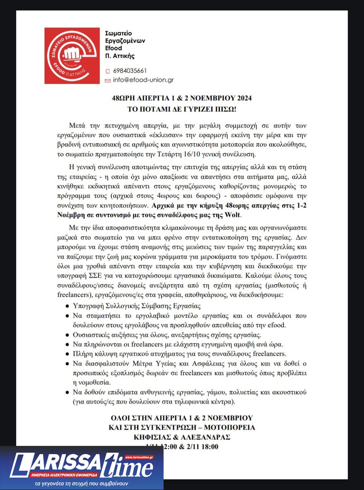 Σε συντονισμό με τους συναδέλφους τους στην Wolt κήρυξαν 48 απεργία από τις 00:01 της Πέμπτης 1 Νοεμβρίου μέχρι τις 23:59 της Παρασκευής 2 Νοεμβρίου. Καταγγέλουν πως όχι μόνο δεν έλαβαν απάντηση στα αιτήματά τους, αλλά καθορίστηκε μονομερώς το πρόγραμμα των συναδέλφων τους που εργάζονται με μερικής απασχόλησης συμβάσεις ως 4ωροι και 6ωροι.