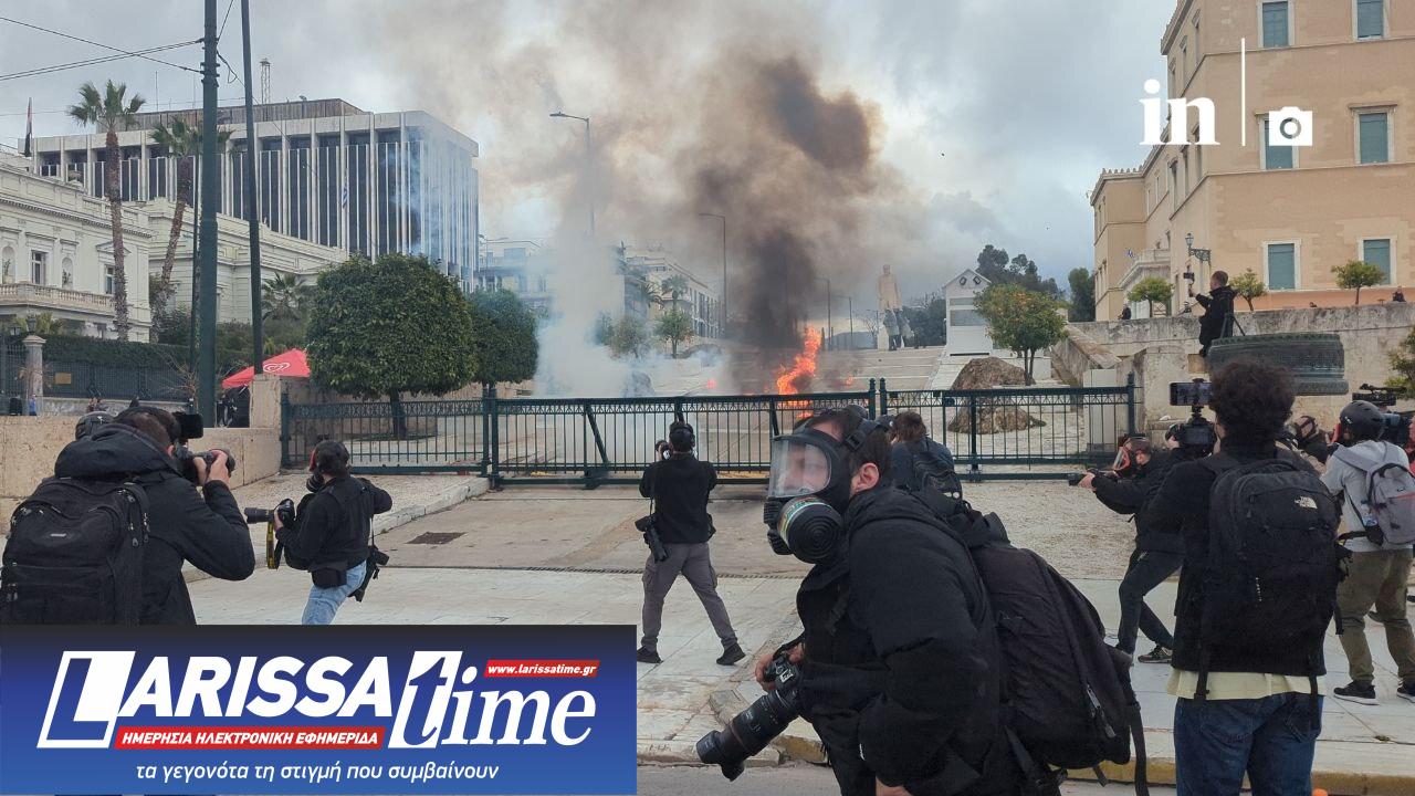 Επεισόδια σημειώθηκαν λίγο μετά τις δύο το μεσημέρι στο Σύνταγμα στο πλαίσιο της 24ωρης απεργίας που κήρυξαν η ΑΔΕΔΥ, το Εργατικό Κέντρο Αθήνας, το ΠΑΜΕ, Εργατικά Κέντρα και Ομοσπονδίες του ιδιωτικού και δημόσιου τομέα, με αφορμή τη συμπλήρωση ενός χρόνου από το σιδηροδρομικό δυστύχημα στα Τέμπη που κόστισε τη ζωή σε 57 ανθρώπους.