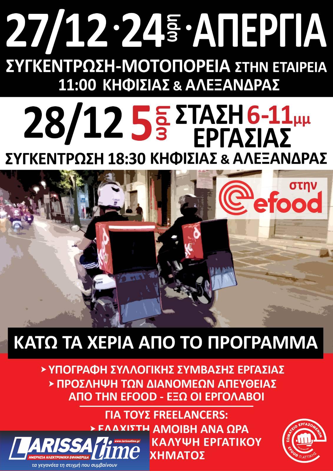 Το Σωματείο Εργαζομένων efood Ν. Αττικής, απαιτεί την υπογραφή Συλλογικής Σύμβασης Εργασίας με ουσιαστικές αυξήσεις στους μισθούς για όλους, πρόσληψη διανομέων απευθείας από την efood και όχι από τους εργολάβους και για τους freelancers ελάχιστη αμοιβή ανά ώρα και ασφαλιστική κάλυψη εργατικού ατυχήματος. Ζητά επίσης να διασφαλιστούν μέτρα υγείας και ασφάλειας για όλους και να δοθεί ο προσωπικός εξοπλισμός δωρεάν σε freelancers και μισθωτούς, όπως προβλέπει η νομοθεσία, να δοθούν επιδόματα ανθυγιεινής εργασίας, γάμου και ακουστικού (για αυτούς που δουλεύουν στα τηλεφωνικά κέντρα).