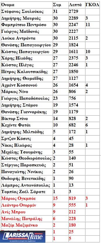 Το aelole.gr συγκέντρωσε και σας παραθέτει χρήσιμα στατιστικά στοιχεία για τους ποδοσφαιριστές της ΠΑΕ ΑΕΛ στο πρωτάθλημα της Super League 2 και το Κύπελλο Ελλάδας την σεζόν 2023-2024, έχοντας δώσει συνολικά 33 επίσημα παιχνίδια. Οι προπονητές της ΑΕΛ, Παναγιώτης Γκουτσίδης, Παύλος Δερμιτζάκης, χρησιμοποίησαν 35 ποδοσφαιριστές, στους 33 αγώνες του φετινού πρωταθλήματος της Super League 2 και του Κυπέλλου Ελλάδας. Ανάμεσα στους 35 ποδοσφαιριστές, πρώτος σε χρόνο συμμετοχής είναι ο Στέφανος Σουλούκος με 2729 λεπτά, ενώ ακολούθησε ο Δημήτρης Μαυριάς με 2289. Το μικρότερο χρόνο συμμετοχής είχε ο Τομπίας Ζοέλ Σάρατε που αγωνίστηκε μόλις 3 λεπτά, μιας και ήταν τραυματίας. Υπήρχαν τρεις παίκτες στο ρόστερ που δεν αγωνίστηκαν ούτε λεπτό, που ήταν ο Νίκος Κουκουράβας, ο Βασίλης Αρσένης και ο Κυριάκος Ζησούλης. Με κόκκινο οι παίκτες που αποχώρησαν κατά τη διάρκεια της σεζόν από την ΑΕΛ.