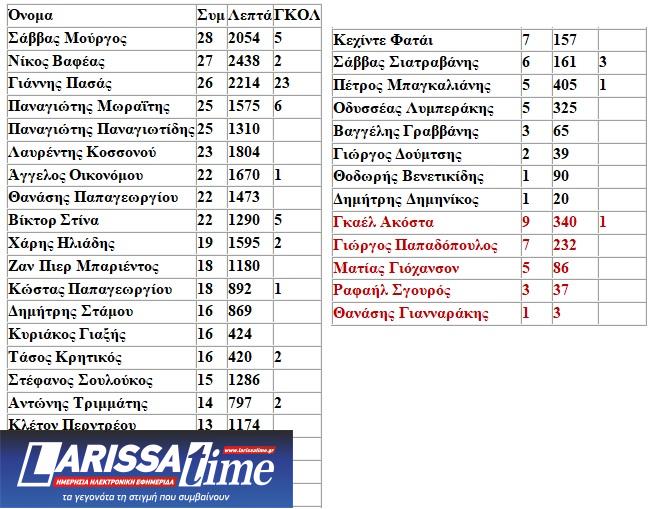 Δείτε στατιστικά στοιχεία από το aelole.gr για τους ποδοσφαιριστές της ΠΑΕ ΑΕΛ τη σεζόν 2024-2025, έχοντας δώσει 28 επίσημα παιχνίδια. Ο τεχνικός, Αλέκος Βοσνιάδης, χρησιμοποίησε 34 ποδοσφαιριστές, στους δεκαοκτώ αγώνες της κανονικής διάρκειας της Super League 2, Play Off και Κυπέλλου. Ανάμεσα στους 34 ποδοσφαιριστές, πρώτος σε συμμετοχές είναι ο Σάββας Μούργος, ενώ το μικρότερο χρόνο συμμετοχής είχε ο Θανάσης Γιανναράκης που αγωνίστηκε μόλις 3 λεπτά και αποχώρησε. Υπάρχουν δύο παίκτες στο ρόστερ που δεν έχουν αγωνιστεί ούτε λεπτό στην Superleague 2, που είναι οι Μιχάλης Πίτσικος και Κωνσταντίνος Γκρόζος. Με κόκκινα γράμματα όσοι έχουν αποχωρήσει από την ΠΑΕ ΑΕΛ.