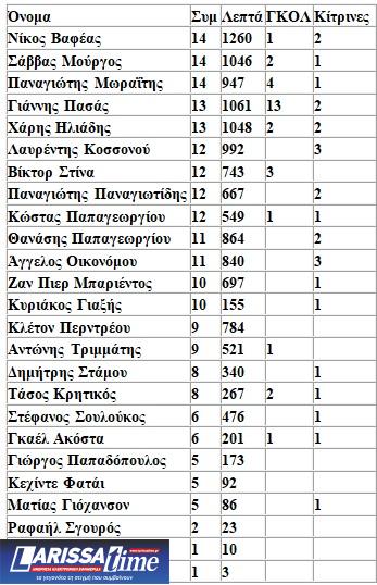 Δείτε στατιστικά στοιχεία από το aelole.gr για τους ποδοσφαιριστές της ΠΑΕ ΑΕΛ στο πρωτάθλημα της Super League 2 την σεζόν 2024-2025, έχοντας δώσει δεκατέσσερα επίσημα παιχνίδια. Στο πρωτάθλημα ο τεχνικός, Αλέκος Βοσνιάδης, χρησιμοποίησε 25 ποδοσφαιριστές, στους δεκατέσσερις αγώνες της φετινής Super League 2. Ανάμεσα στους 25 ποδοσφαιριστές, πρώτος σε συμμετοχές και χρόνο είναι ο Νίκος Βαφέας με 1260 λεπτά, ενώ το μικρότερο χρόνο συμμετοχής έχει ο Θανάσης Γιανναράκης που έχει αγωνιστεί μόλις 3 λεπτά. Υπάρχουν τέσσερις παίκτες στο ρόστερ που δεν έχουν αγωνιστεί ούτε λεπτό στην Superleague 2, που είναι οι Θοδωρής Βενετικίδης, Μιχάλης Πίτσικος, Κωνσταντίνος Γκρόζος, Δημήτρης Δημηνίκος,