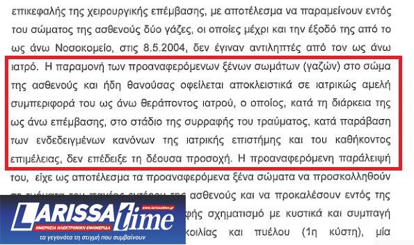 Όπως συμπληρώνεται ακόμη στην δικαστική απόφαση: «Η συγκεκριμένη παράλειψη είχε ως αποτέλεσμα τα προαναφερόμενα ξένα σώματα να προσκολληθούν σε τμήματα του παχέος εντέρου της ασθενούς και να προκαλέσουν εντός της κοιλίας της έναν ευμεγέθη μικτής υφής σχηματισμό και περαιτέρω σοβαρές σωματικές βλάβες, μετά φλεγμονώδους αντίδρασης της πάσχουσας περιοχής».